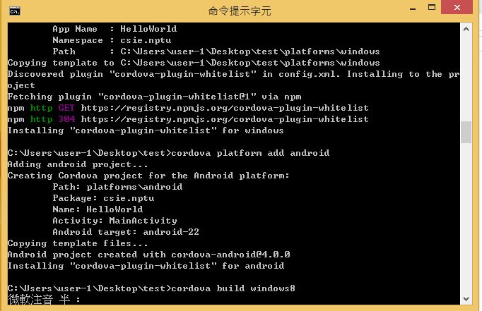cordova create test csie.nptu HelloWorld
