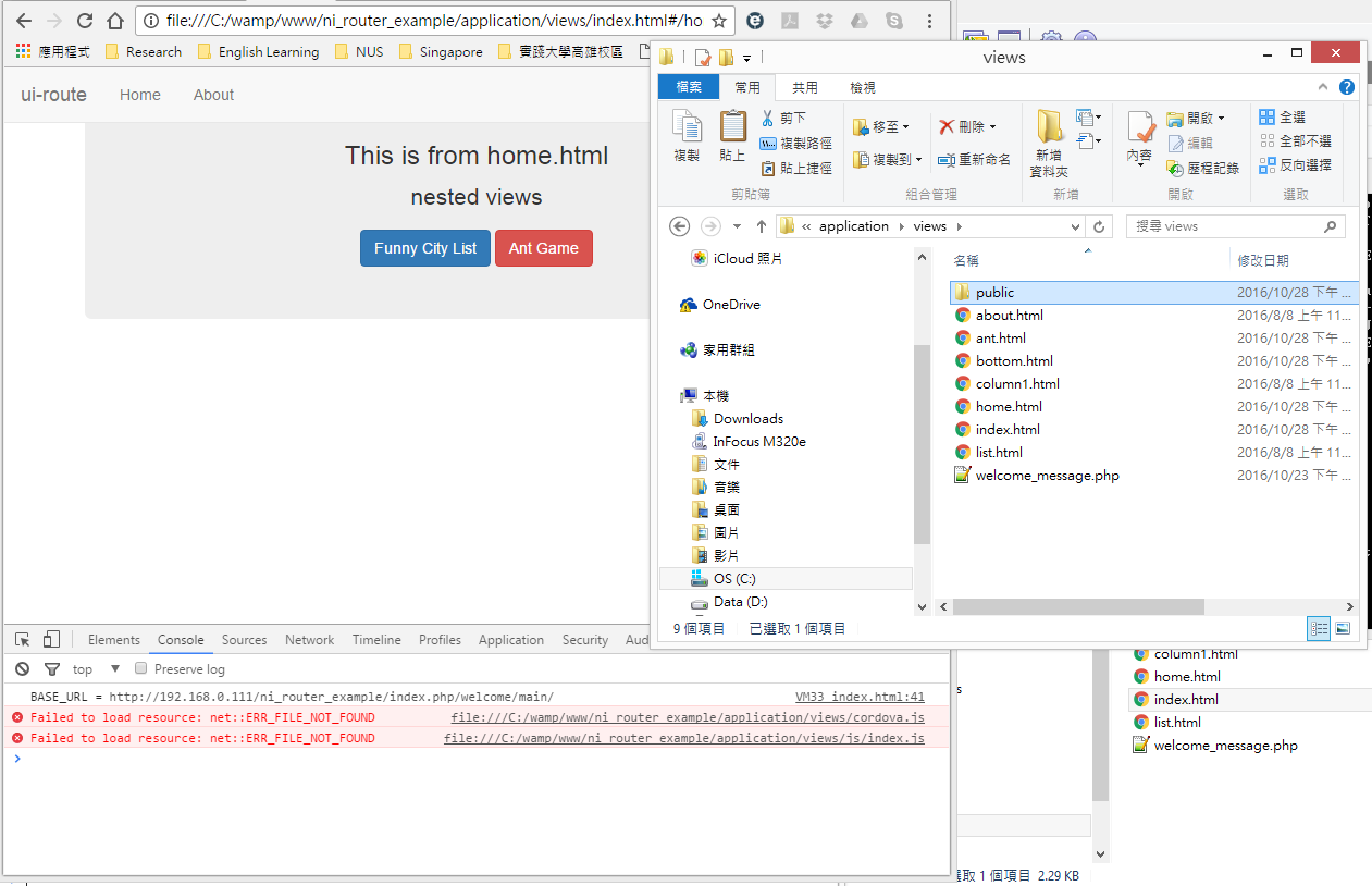 5. 修改ni_router_example內的index.html,將app.js的路徑改成public/app.js,app.js內的路由檔案改成符合CodeIgniter的存取格式